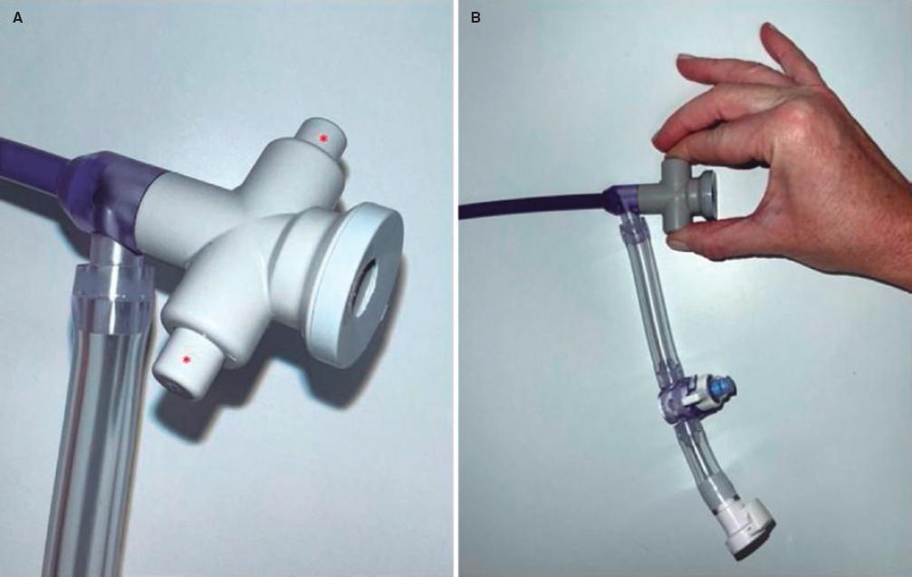 Figura 1 A: válvula de un catéter de tromboaspiración de gran calibre. El asterisco indica los 2 botones que, al ser presionados, permiten abrir la válvula. B: apertura de la válvula mediante compresión de los 2 botones. En pacientes con oxigenador extracorpóreo de membrana (ECMO), antes de realizar la apertura de esta o de cualquier otra válvula se debe disminuir o parar la asistencia.