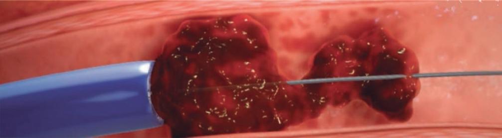 Otra de las potenciales complicaciones que se deben tener en cuenta es la obstrucción de la cánula venosa del ECMO por embolización de material trombótico, que incluso puede producir la parada del sistema. La obstrucción de la cánula venosa ocurre como consecuencia de la embolización de material trombótico procedente del catéter de tromboaspiración (figura 2). Esto suele pasar cuando el catéter de tromboaspiración queda obstruido por un trombo de gran tamaño y requiere su extracción manual fuera de la vena del paciente. En el recorrido del catéter hacia el exterior se acerca al extremo distal de la cánula venosa y es cuando se produce el momento de mayor riesgo de embolización. Durante la retirada deben tomarse las siguientes precauciones: a) mante- ner la presión negativa en el catéter de tromboaspiración; b) disminuir el flujo del ECMO para reducir el poder de succión de la cánula venosa; c) retirar el catéter de tromboaspiración de manera rápida e ininterrumpida.