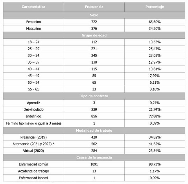 Se realizó el análisis de la base de datos que comprende los trabajadores corporativos tanto presenciales, virtuales como en alternancia, entre el periodo del 1 de enero de 2019 y el 30 de noviembre de 2022 para un total de 1099 ausentes. Se excluyeron las licencias de maternidad y de paternidad por no corresponder a causa médica, así como licencia para el ejercicio de sufragio, licencia para el desempeño de cargos oficiales de forzosa aceptación, por calamidad doméstica, por comisión sindical, por entierro de compañeros y licencia de luto por ser licencias de causa legal.