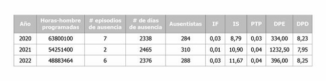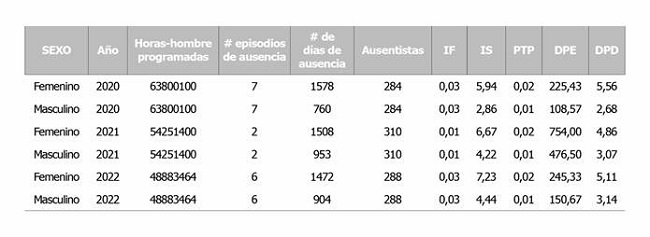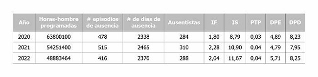 Finalmente, en el 2022 el rango de edad entre 50 y 54 años presentaron el mayor número de días de ausencia con 446 días, con mayor índice de severidad con 2,19, duración promedio de episodios de ausencia 1,07 y duración promedio de días perdidos por persona ausente 1,55.