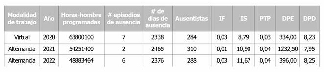 Para el año 2020 fue la modalidad virtual la que presentó mayor días de ausencia encontrándose para este año 2338 días de ausencia. Para los años 2021 y 2022 se lleva a cabo la modalidad de alternancia con mayor número de días de ausencia para el año 2021 con 2465 días, sin embargo con un índice de frecuencia, índice de severidad y duración promedio de días perdidos por persona ausente mayor para el año 2022 así: IF 0,03, IS 11,67 y DPD 8,25. Pero para el caso de duración promedio de episodio de ausencia fue para el año 2021 en la modalidad de alternancia mayor con 1232,50 (ver Tabla 5).