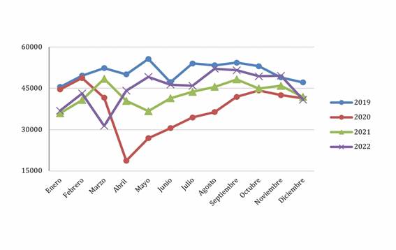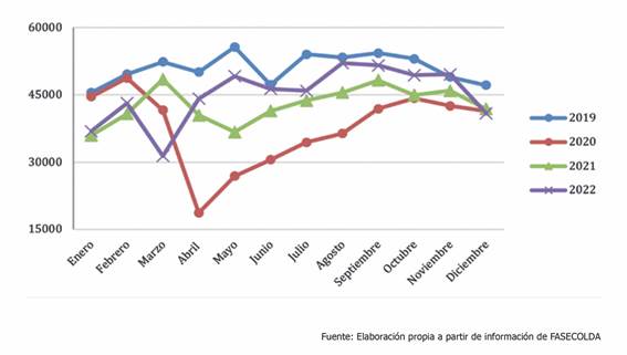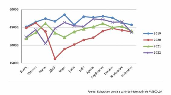 En la Figura 2 se presentan los accidentes de trabajo ocurridos en el periodo de estudio (2019 a 2022), donde se evidencia la disminución en la cantidad de accidentes de trabajo en el año 2020 con relación al 2019, situación que se reforzó a partir del mes de marzo cuando se declaró la emergencia sanitaria y el confinamiento preventivo a nivel nacional13. Así mismo, se puede identificar un aumento paulatino en los accidentes de trabajo.
