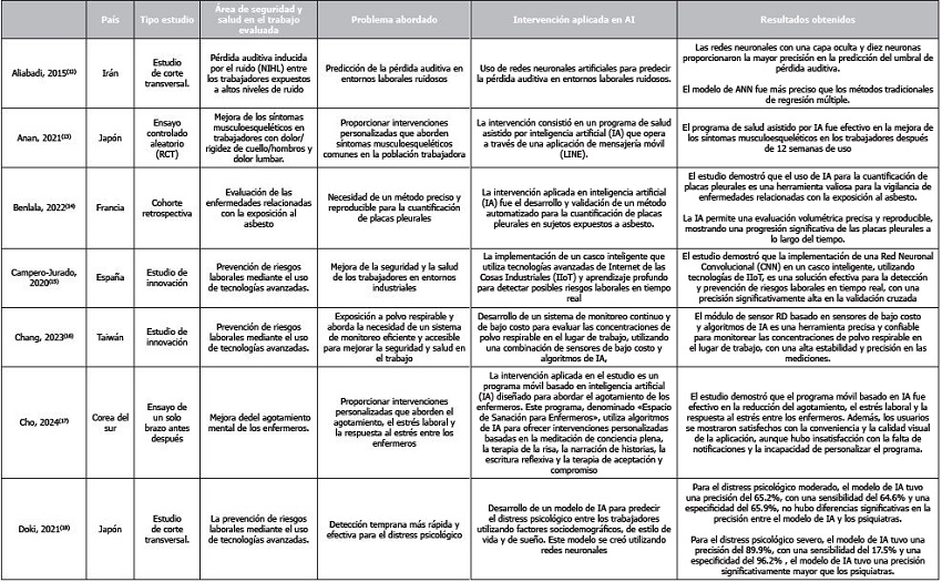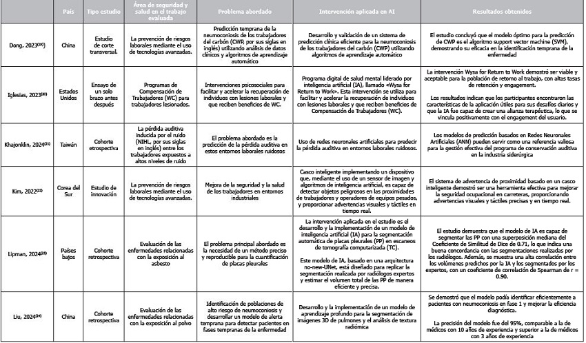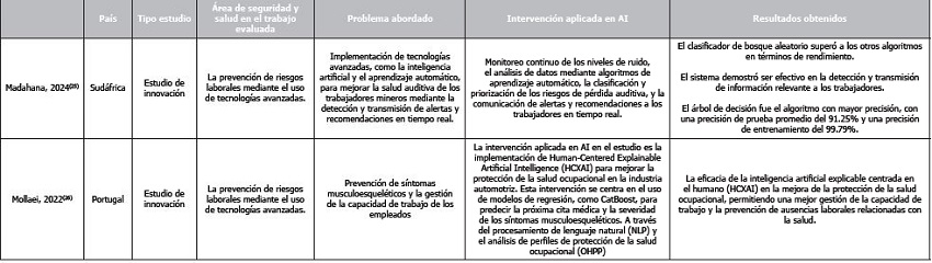 Las intervenciones aplicadas en inteligencia artificial (IA) en el ámbito de la seguridad y salud en el trabajo son diversas y abarcan múltiples enfoques innovadores. Una de las intervenciones más comunes es el uso de redes neuronales artificiales para predecir la pérdida auditiva en entornos laborales ruidosos. Estos estudios se enfocan en desarrollar modelos predictivos que utilicen datos de exposición al ruido para anticipar la pérdida auditiva, permitiendo intervenciones preventivas que protejan la salud auditiva de los trabajadores. Este enfoque ha sido implementado en varios estudios debido a su potencial para reducir significativamente los riesgos asociados con la exposición prolongada al ruido en el lugar de trabajo. Tabla 1.