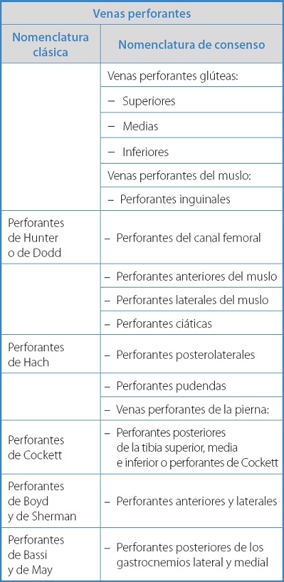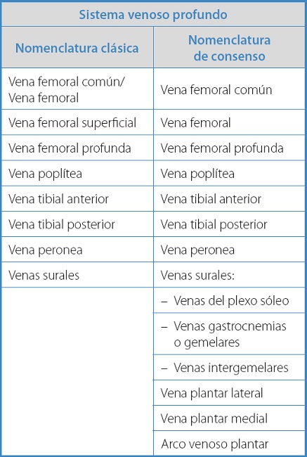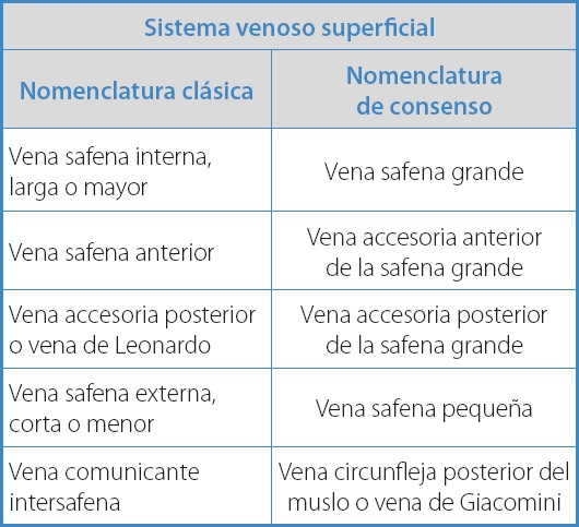 Las venas de las extremidades son muy numerosas. Se distinguen en ellas distintos grupos venosos en relación con su posición respecto a las fascias musculares. El sistema venoso profundo se encuentra por debajo de estas fascias. El sistema venoso superficial se ubica por encima de la fascia muscular. Los grupos de venas perforantes comunican ambos perforando la fascia. Se ha consensuado una nomenclatura nueva de cara a establecer uniformidad respecto a las numerosas venas de las extremidades inferiores, aboliendo expresiones que pudiesen confundir respecto a la posición de la vena mencionada, y evitando el exceso de epónimos. Las tablas siguientes muestran la equivalencia entre las nomenclaturas clásica y actual. Separamos las venas del sistema venosa profundo (tabla I), superficial (tabla II) y las perforantes (tabla III), y las adaptamos a las que, creemos, son de uso más común (8,9).