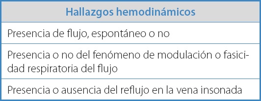 Después de la valoración morfológica inicial descrita, en modo B, se debe evaluar el flujo venoso mediante técnica Doppler. Son válidas las dos vertientes de Doppler usuales, tanto el Doppler color como el Doppler pulsado. El Doppler color ofrece un uso más directo y sencillo, aunque suele ser menos sensible que la función Doppler pulsado del ecógrafo para la evaluación del flujo. La exploración hemodinámica pone de manifiesto:
