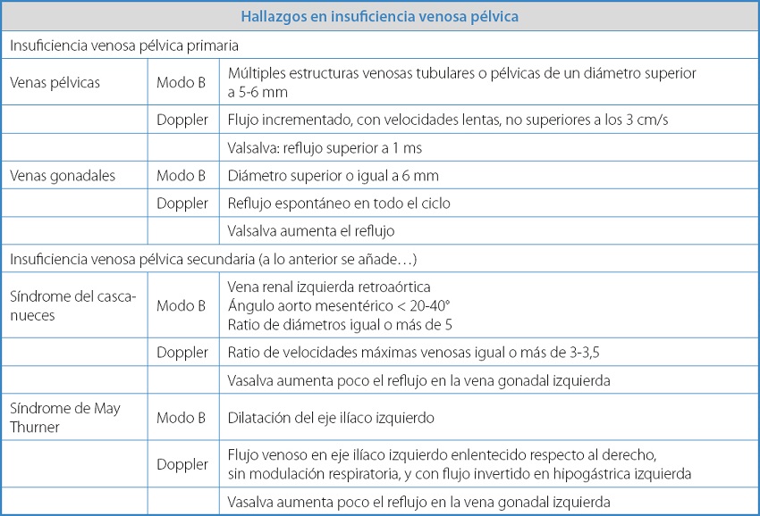 Los signos ecográficos que caracterizan la insuficiencia venosa pélvica son diversos, aunque no están establecidos profundamente. La insuficiencia venosa pélvica se caracteriza por la presencia en el modo B de la ecografía Doppler de estructuras venosas tubulares pélvicas de un diámetro superior a 5-6 mm, múltiples y unilaterales o bilaterales. La aplicación del modo Doppler, color o pulsado, sobre estas estructuras permite caracterizar el flujo venoso en las mismas. Este flujo se observa incrementado, aunque la medición de sus velocidades evidencia un enlentecimiento en las mismas, no siendo superiores a los 3 cm/s. Por otra parte, siempre en modo Doppler, color o pulsado, la realización de una maniobra de Valsalva, constata un reflujo en las estructuras venosas tubulares pélvicas descritas superior a 1 m/s. Las venas gonadales presentan también características propias de la insuficiencia venosa pélvica. En concreto, la dilatación de la vena gonadal superior o igual a 6 mm sería patognomónico de insuficiencia venosa de esta estructura. En cuanto a la evaluación Doppler de estas estructuras venosas, nuevamente se caracteriza por la existencia de reflujo espontáneo. El reflujo es importante y continuo en todo el ciclo respiratorio, aunque modulado por este, en caso de insuficiencia venosa pélvica primaria. Además, se incrementa mucho con la maniobra de Valsalva. En cambio, cuando se constata patología estenótica u obstructiva como causa de la insuficiencia venosa pélvica, el reflujo, aunque espontáneo, es mucho más leve, continuo en todo el ciclo respiratorio, aunque sin modulación por parte de este, y sin incremento con la maniobra de Valsalva. La sensibilidad de la ecografía para la detección de las venas gonadales es del 100 % en el caso de la izquierda, y del 67 % en el caso de la derecha.