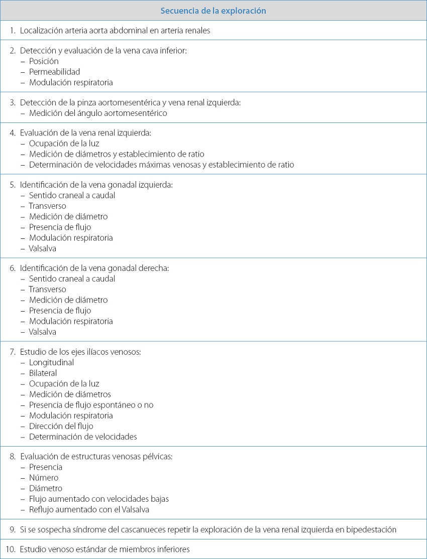 Una posible metodología de exploración ecográfica en la insuficiencia venosa pélvica es expuesta a continuación. La exploración precisa del paciente en decúbito supino y en estado de ayunas al menos 6 horas previas. Es necesario el uso de ecógrafos de gama alta, que permitan una adecuada resolución abdominal. La prueba se realiza con sonda emisora de bajas-medianas frecuencias (3-5MHz), convexa, puesto que se trata de un examen de la cavidad abdominopélvica. No suelen existir programas específicos para este tipo de exploraciones venosas. Mencionaremos la necesidad de un adecuado contrastado en modo B o escala de grises, que normalmente se consigue aumentando el rango dinámico, y la necesidad de disminuir la frecuencia de repetición de pulsos, y aumentar la ganancia en los modos Doppler color o pulsado, para captar los mínimos flujos en las estructuras venosas que vamos a analizar. Una nota en cuanto al Doppler color: potenciar en exceso el Doppler color altera mucho la percepción de flujo en las estructuras venosas analizadas, enturbiando con el exceso de color la imagen del conjunto. Es necesario, pues, lograr un equilibrio entre la necesidad de aportar este efecto Doppler color a la imagen para su mejor evaluación, y un excesivo artefactado de la imagen por el excesivo color.
