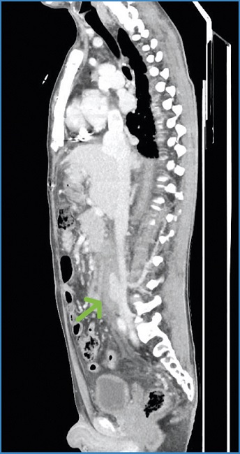 Se realizó nuevo control radiológico a las dos semanas, que evidenció pseudoaneurisma de VCI bilobulado de 32,7 × 33,9 mm (AP × T) con afectación de bifurcación ilíaca y extensión a vena ilíaca común derecha, sin signos de hemorragia activa y mejoría del hematoma retroperitoneal. Dada la buena evolución clínica y radiológica, el paciente fue dado de alta para seguimiento ambulatorio.