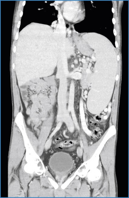 A los dos meses el paciente acudió a consultas de Cirugía Vascular. Presentaba buen estado general. El angio-TAC reveló la completa resolución del pseudoaneurisma de la VCI y del hematoma retroperitoneal (Fig. 2).