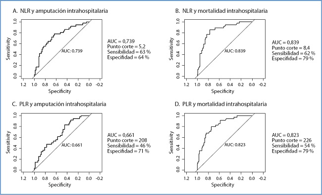 Figura 1. Curvas ROC: A. NLR y amputación intrahospitalaria. B. NLR y mortalidad intrahospitalaria. C. PLR y amputación intrahospitalaria. D. PLR y mortalidad intrahospitalaria. NLR: índice neutrófilos/linfocitos; PLR: índice plaquetas/linfocito; AUC: área bajo la curva.