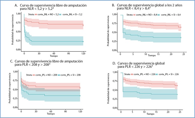 Figura 2. Curvas de Kaplan-Meyer. A. Curvas de supervivencia libre de amputación para NLR < 5,2 y > 5,2; B. Curvas de supervivencia global a los 2 años para NLR < 8,4 y > 8,4; C. Curvas de supervivencia libre de amputación para PLR < 208 y > 208; D. Curvas de supervivencia global para PLR < 226 y > 226. *Tiempo en días. †Tiempo en meses.