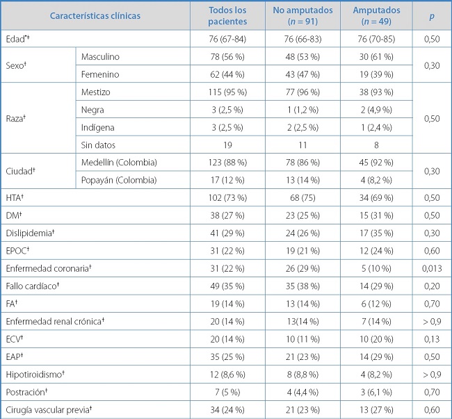 Se identificaron 140 pacientes con isquemia aguda de los miembros inferiores y con características sociodemográficas homogéneas. De estos, el 56 % correspondió a hombres, con predominio de raza mestiza (95 %). La mediana de edad fue de 76 años (RIQ: 67-84). La comorbilidad más frecuente fue la hipertensión arterial (73 %, n = 102) y se identificó tabaquismo actual en un 26 % (n = 36) o pasado en un 40 % (n = 56). Un 24 % de los casos ya presentaban antecedente de cirugía vascular previa: 17 (50 %) de estos casos eran cirugías derivativas y el 29,4 % (n = 10), amputaciones de la extremidad contralateral. Los pacientes se analizaron en dos grupos: aquellos a los que se les realizó una amputación en el hospital (91 casos, 65 %) y aquellos a los que no se les practicó una amputación (49 casos, 35 %), cuyas características se presentan en la tabla I.