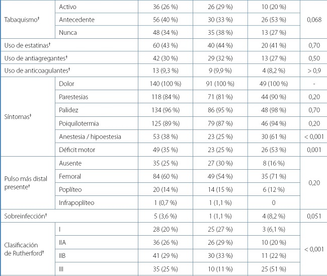 En el análisis no ajustado, los grupos eran estadísticamente comparables. Como único punto de diferencia se encontró el antecedente de enfermedad coronaria, que fue mayor en los pacientes que no fueron amputados (29 % frente a 10 %; p = 0,013). Los síntomas de dolor, palidez y poiquilotermia fueron los más frecuentes, pero la presencia de anestesia/hipoestesia (61 % frente a 25 %; p < 0,001) y el déficit motor se presentaban con mayor frecuencia en los pacientes amputados (53 % frente a 23 %; p = 0,001). Se encontró como único pulso el femoral (60 %) y se documentaron datos de sobreinfección al ingreso en el 3,6 % de los casos.