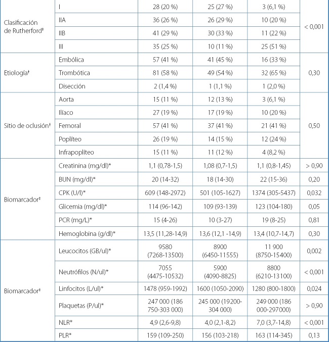 La mayoría de los pacientes ingresaron con una clasificación de Rutherford IIB (n = 41, 29 %), seguidos por aquellos que presentaban cambios irreversibles (clasificación Rutherford III), en el 25 % de los casos (n = 35). La etiología más frecuentemente reportada fue la trombosis, en el 58 % (n = 81) de los casos, y la aterotrombosis fue la más prevalente. El sitio de oclusión más frecuente fue la región femoral, en el 41% de los pacientes (n = 57). En el análisis de los biomarcadores, se encontró una relación estadísticamente significativa con el recuento de leucocitos, de linfocitos y de plaquetas entre el grupo de amputados y de no amputados. Al evaluar los NLR, la mediana al ingreso fue de 4,9. El grupo que fue llevado a amputación tenía valores más elevados en (7,0 frente a 4,0; p < 0,001). El PLR fue mayor en los pacientes amputados sin encontrar diferencias estadísticamente significativas (Tabla I).