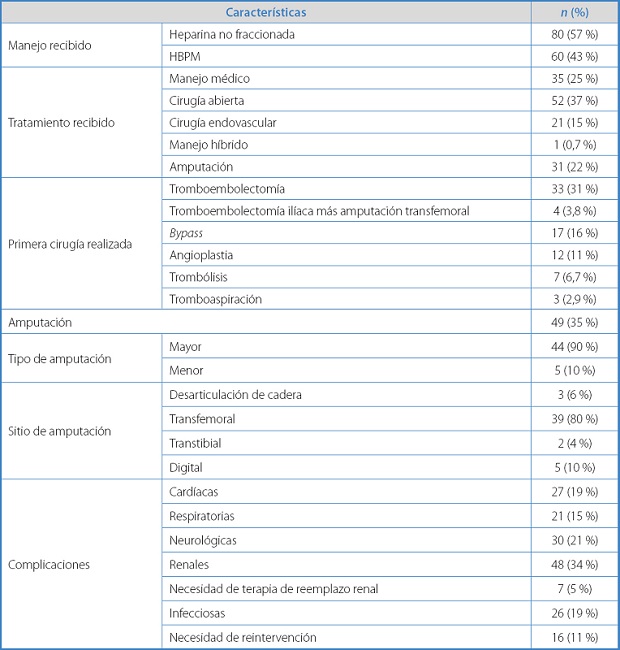 La totalidad de los pacientes recibió anticoagulación formal y la heparina no fraccionada se usó en el 57 % de los casos. Las técnicas quirúrgicas abiertas fueron las más empleadas como terapia de salvamento de la extremidad (37 %). La más frecuente fue la tromboembolectomía, seguida por la amputación primaria en pacientes con cambios irreversibles o postrados en cama 22 % (n = 31) en los que la amputación transfemoral fue la que más se realizó (80 %). En el seguimiento intrahospitalario, el 11 % (n = 16) requirió una segunda intervención. Las complicaciones más encontradas fueron las renales (34 %); sin embargo, solo se requirió hemodiálisis en el 5 % de los pacientes. Las complicaciones neurológicas se presentaron en segundo lugar (21 %), seguidas por las cardiacas (19 %). Se documentó la infección del sitio operatorio en el 19 % (n = 26) de los casos (Tabla II).