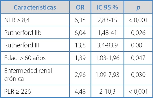 Frente a la mortalidad, el punto de corte por el NLR fue de 8,4, prediciendo con una sensibilidad del 62 % y una especificidad del 79 % la mortalidad intrahospitalaria (AUC: 0,83; OR: 6,38; IC 95 %, 2,83-15) (Fig. 1). Otros factores relacionados con la mortalidad intrahospitalaria fueron: clasificaciones de Rutherford IIB (OR: 6,04; IC 95 %, 1,48-41) y III (OR: 13,8; IC 95 %, 3,4-93,9), edad > 60 años (OR: 1,39; IC 95 %, 1,03-1,96) y la presencia de enfermedad renal crónica (OR: 2,96; IC 95 %, 1,09-7,93) (Tabla III). De igual forma, un NLR > 8,4 se correlaciona con una disminución del doble de la supervivencia global (HR: 2,58; IC 95 %, 1,55-4,28; p < 0,001) (Fig. 2).