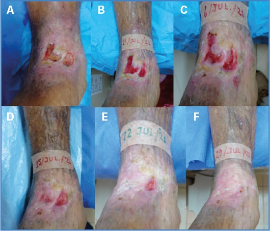 72 horas después se realizó una segunda curación con SSN 0,9 % y aplicación de crema granulante. Además, se le realizó ablación química con microespuma ecoguiada (ENOF) de reflujo axial con polidocanol al 3 %, según técnica de Tessari. Se continuó con la tercera curación y control; se corroboró por eco Doppler la oclusión de la SM, perforante paratibial y varices infrapatelares; se enfatizó la importancia de mejorar los rangos de movilidad del cuello del pie, se prescribió plantilla y se continuó con las curaciones dos veces por semana, con lo que se logró la cicatrización de las úlceras venosas en 4 semanas (Fig. 1).
