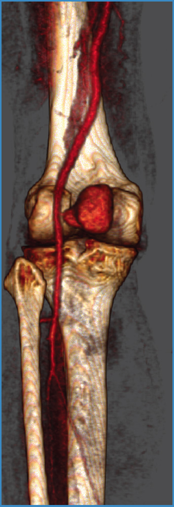 Figura 1. Angiografía por tomografía computarizada donde se aprecia voluminoso pseudoaneurisma poplíteo con un cuello pequeño y estrecho localizado en la 2.a porción de la arteria poplítea.