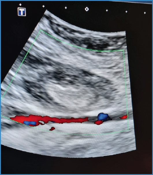 Una vez comprobada la trombosis del pseudoaneurisma (Fig. 2), se dejó a la paciente en reposo absoluto y con compresión local.