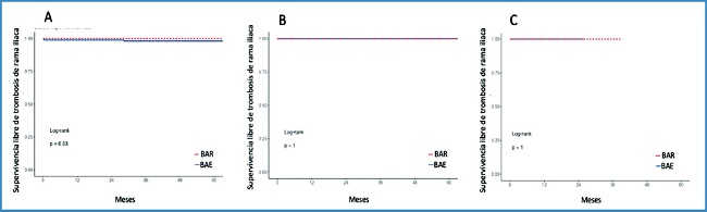 Los objetivos primario y secundario se analizan en la tabla IV. Con un seguimiento medio de 40,5 meses (0,5-124 meses), se analizó la permeabilidad ilíaca en 420 ramas (94 BAE y 316 BAR), con un porcentaje de trombosis del 0 % en BAE y 1,6 % en BAR (p = 0,593). Un paciente presentó claudicación glútea a largas distancias por oclusión de la rama ilíaca izquierda y fue tratado de manera conservadora. Los otros 4 pacientes presentaron clínica de isquemia aguda, a 3 se les practicó un bypass fémoro-femoral y al cuarto un bypass axilo-femoral. La mediana de tiempo de aparición de la trombosis fue de 16 días (4 días-76 meses). Atendiendo a cada una de las endoprótesis, la supervivencia libre de trombosis de ramas ilíacas fue del 100 % durante el seguimiento tanto en Excluder® como en Ovation®, para ambos grupos. En el caso de Endurant®, se observó una supervivencia libre de trombosis a 1, 3 y 5 años del 100 %, 100 % y 100 %, respectivamente, en BAE, y del 98,8 %, 98,1 % y 98,11 %, respectivamente, para BAE (log rank = 0,33), se muestran las gráficas en la figura 1.