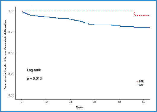 La supervivencia libre de reintervención asociada al dispositivo (Fig. 2) a 1 mes, 1, 5 y 10 años fue 98,1 %, 92,9 %, 83,4 % y 79,1 % en BAR, y 100 %, 100 %, 94,7 % y 94,7 % en BAE, respectivamente (log rank p = 0,013).