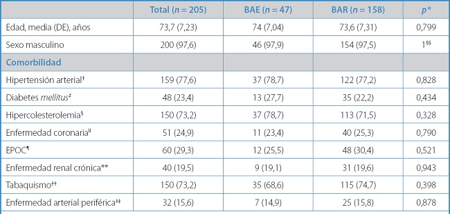 ‡‡Definida como índice tobillo-brazo < 0,90. §§Test exacto de Fisher