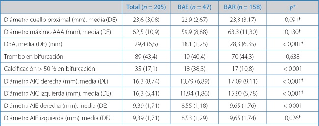 BAE: bifurcación aórtica estrecha; BAR: bifurcación aórtica regular. Las variables categóricas se presentan como n (porcentaje).