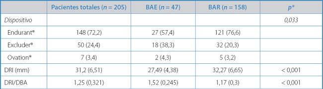 Al analizar las endoprótesis de manera individual, el DBA era de 26,8 ± 7 mm en Endurant®, 23,8 ± 6,1 mm en Excluder® y 24,3 ± 6 mm en Ovation® (p = 0,03) y respecto a la ratio DRI/DBA, obtuvimos las cifras de 1,26 ± 0,32 en Endurant®, 1,2 ± 0,27 en Excluder® y 1,36 ± 0,5 en Ovation® (p = 0,348).