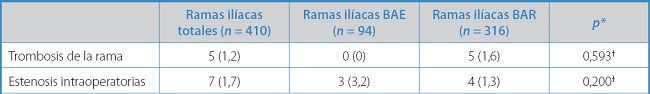 Orrico y cols. (14) no mostraron diferencias estadísticamente significativas en el número de estenosis intraoperatorias (2,1 % en BAR y 3,2 % en BAR), lo que concuerda con nuestros resultados, a pesar de poner un punto de corte para la BAE mucho menor (16 mm). Tampoco documentan diferencias en la oclusión de las ramas ilíacas (3,2 % BAE frente a 2 % BAR).