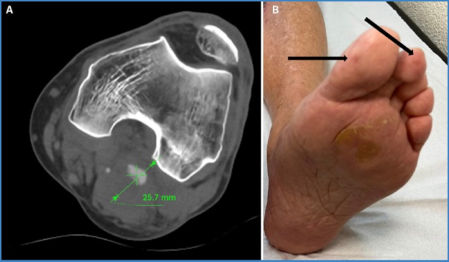 Figura 1. A. Aneurisma poplíteo izquierdo, diámetro al diagnóstico. B. Flechas negras: lesiones cianóticas puntiformes digitales sugerentes de embolización distal.