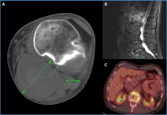 Figura 2. A. Aneurisma poplíteo izquierdo con crecimiento de saco e imágenes sugestivas de rotura. B. RMN de columna lumbar con afectación de L1 y L2. C. PET-TC de columna vertebral con cambios sugestivos de espondilodiscitis.