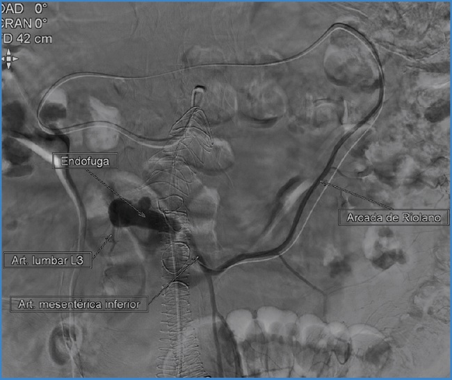 Las endofugas de tipo II (T2EL) se originan por ramas vasculares permeables, generalmente a través de la arteria mesentérica inferior (AMI) o arterias lumbares en pacientes tratados de reparación endovascular de aneurisma de aorta (EVAR). Las T2EL son las complicaciones más frecuente tras el EVAR, y aunque la mayoría se resuelve espontáneamente, son la primera causa de reintervención. A pesar de no haber evidencia solida que indique el tratamiento de las T2EL, las últimas directrices de la ESVS recomiendan considerar la reparación endovascular si existe crecimiento significativo del saco (más de 10 mm) en comparación con el valor inicial o el diámetro más pequeño informado durante el seguimiento (1). En caso de tratarlas, disponemos del abordaje endovascular, que consiste en la embolización transarterial, transprotésica, transperitoneal, transcava o translumbar de las ramas permeables o del saco mediante el uso de diferentes agentes embolizantes. El éxito técnico es alto, aunque la recurrencia de endofugas es frecuente. La reparación quirúrgica abierta se reserva para casos de abordaje endovascular fallido y se centra en ligar directamente las arterias nutricias.