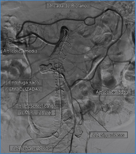 Figura 1. Arteriografía diagnóstica en la que se visualiza la T2EL, que conecta con la AMI y una lumbar permeable.