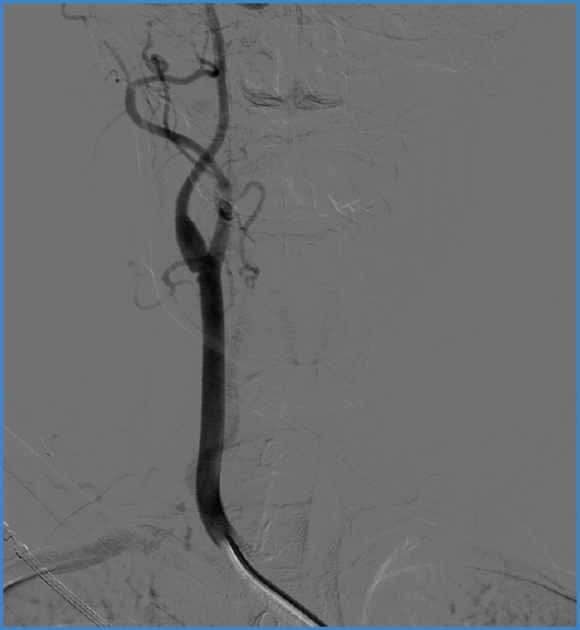 Figure 1. Arteriography image following an emergency thrombectomy procedure showing a septum in the right internal carotid artery suggestive of carotid web.