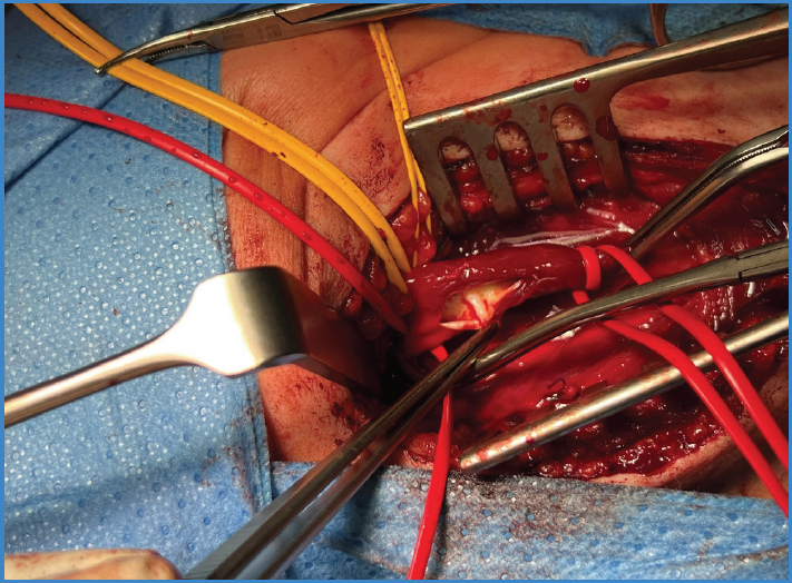 Carotid web is an intimal protrusion of uncertain prevalence, predominantly seen in women, which is commonly located on the proximal posterolateral face of the internal carotid artery. It is associated with transient ischemic attacks and embolic strokes in young patients without classical cardiovascular risk factors (1). This occurs due to hemodynamic impairment of flow distal to the septum (2). Diagnosis is established through CT angiography or magnetic resonance imaging (3). Surgical treatment, through stenting or endarterectomy, has been shown to reduce the risk of recurrent ischemic episodes, which occur in 26.8 % of symptomatic patients treated exclusively with pharmacological antiplatelet, anticoagulant therapy, or a combination of both (4). Despite the lack of studies on the subject, the relevance of this disease has been increasing, influencing its recent inclusion in the latest European clinical practice guidelines, which recommend surgical treatment with stenting or endarterectomy for symptomatic patients with no other cause to explain their neurological symptoms after a thorough evaluation (level of evidence IIB, grade of recommendation C) (5). In our case, the use of an autologous vein patch for the carotid closure was chosen due to the patient’s age and the lower rate of long-term infectious complications (6).