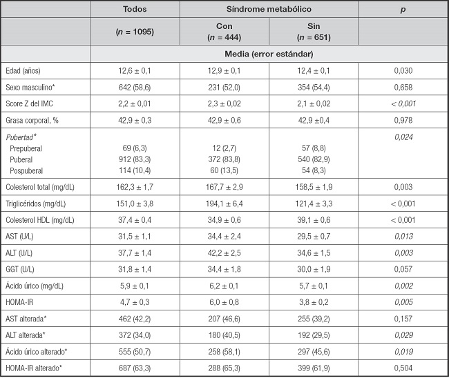 Tabla I. Comparación de características generales y niveles de ácido úrico y enzimas hepáticas entre adolescentes con obesidad con y sin síndrome metabólico.