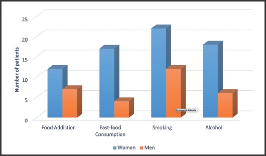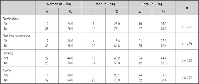 While 57 (75 %) of individuals did not have food addiction, 19 (25 %) had it (Table II and Fig. 1).