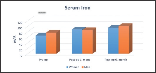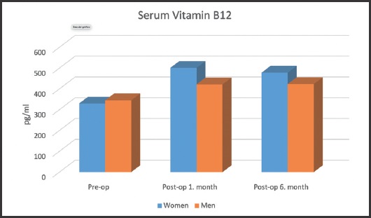 Preoperative iron concentration was found to be lower than at month 1 postsurgery and month 6 postsurgery. In addition, iron levels at month 1 of the postoperative period was found significantly lower than at month 6 postoperatively (Fig. 2). Preoperative B12 was significantly lower than at months 1 and 6 in the postoperative period (Fig. 3). There was no statistically significant difference between the pre- and post-operative periods in serum vitamin B12 and serum iron levels both of men and women (Figs. 2 and 3).