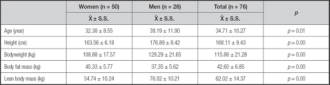 The data of 76 individuals, 50 women and 26 men, were included in the study. Women were 32.38 ± 8.55 years old and men were 39.19 ± 11.90 years old, with a mean age of 34.71 ± 10.27 years. Age, height, body weight, and lean mass values of men are significantly higher than women. Fat mass values of women are significantly higher than men (Table I).