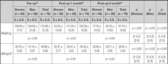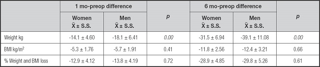 The preoperative BMI values of women and men were significantly higher than the values at months 1 and 6 postoperatively. BMI values at postoperative month 1 were significantly higher than those at postoperative month 6 (Table III).