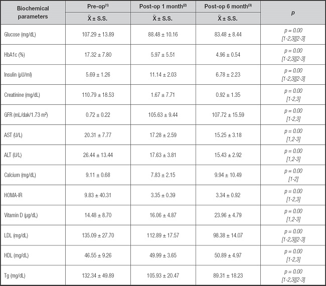Glucose level (83.48 ± 8.44 [mg/dL]) at month 6 postoperatively was found to be statistically lower compared to month 1 postoperatively (88.48 ± 10.16 [mg/dL]) and the preoperative (107.29 ± 13.89 [mg/dL]) period. Preoperative HbA1c, creatinine, AST and ALT values were higher than the values obtained at months 1 and 6 postoperatively. In addition, glucose and HbA1c values in month 1 in the postoperative period were found to be higher than at postoperative month 6. Preoperative GFR and insulin values were significantly lower than at months 1 and 6 postsurgery (p < 0.05) (Table V).