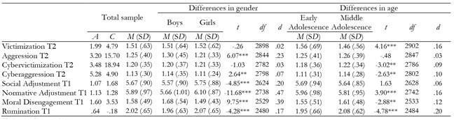 It is also important to consider the effects of gender and age, since important differences have been noted here. In general, boys tend to show higher levels of moral disengagement, social and normative maladjustment than girls (Bjärehed et al., 2020; Jiménez & Estévez, 2017; Longobardi et al., 2018); while the opposite occurs in the case of anger rumination (Zsila et al., 2019). In bullying and cyberbullying, significant differences have been found in terms of the gender and age of the adolescents involved. In fact, previous results show that involvement in bullying and cyberbullying tends to decrease as the adolescent gets older (Cho & Lee, 2020). Finally, although there is no consensus on gender differences in these studies, intercultural studies have pointed to a greater involvement of boys in bullying (Smith et al., 2019) and girls in cyberbullying (Thomas et al., 2015).