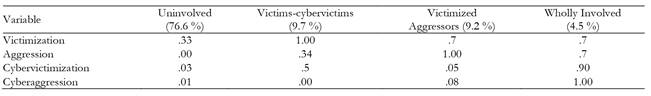 Table 4. Probability of the variables for each latent class according to involvement in bullying and cyberbullying.