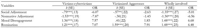 The correlations between the study variables show how involvement in victimization is positively related to aggression and cybervictimization. The correlation analyses revealed a moderate negative relationship between involvement in bullying or cyberbullying and social and normative adjustment, and a positive relationship with the mechanisms of moral disengagement and rumination (see Table 2).