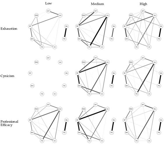 Figure 1. Networks of psychosocial risk factors obtained for different levels of exhaustion, cynicism and professional efficacy.