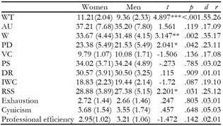 Table 1. Psychosocial risk factor scores and burnout dimensions as a function of gender.