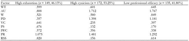 For the definition of the burnout profile, the cut-off points specified in the scales proposed by Salanova et al. (2000) were considered. Based on these cut-off points, categories of low, medium, and high scores were created for the dimensions of emotional exhaustion, cynicism, and professional efficacy. A person was considered to show a profile compatible with burnout when he/she obtained high scores for emotional exhaustion and cynicism while presenting low scores for professional efficacy. The internal consistency estimates for emotional exhaustion (ω = .93, 95% CI [.92, .94]), cynicism (ω = .91, 95% CI [.9, .93]) and professional efficacy (ω = .89, 95% CI [.86, .9]) are considered acceptable for the purposes of this research.