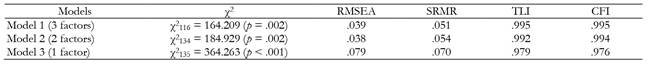 To evaluate the goodness of fit of each model, we inspected the following indices: χ2 significance test, Root Mean Square Error of Approximation (RMSEA), Standardized Root Mean Square Residual (SRMR), Tucker Lewis Index (TLI, also known as Non-normed Fit Index; NNFI), and Comparative Fit Index (CFI).