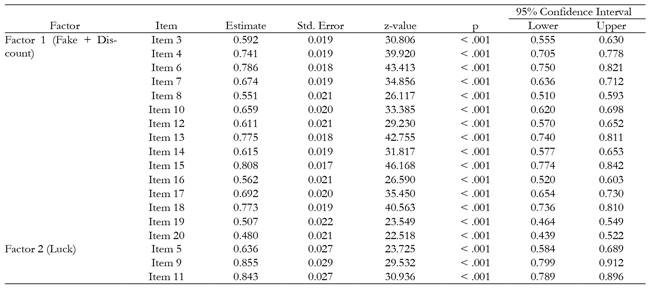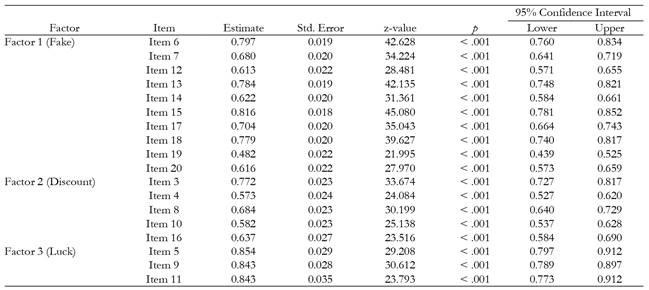 Table 3 shows the fitting results for each of the three models. Model 1 achieved good fit: χ2116 = 150.954 (p =.016) RMSEA =.03, CI (90%) =.015-.048, SRMR =.051 TLI =.996 and CFI =.997). The covariance between factors 1 (Fake) and 2 (Discount) was high (0.915). Model 2 achieved a comparably good fit: χ2134 = 184.929 (p =.002), RMSEA =.038, CI (90%) =.023-.050, SRMR =.054 TLI=.992 and CFI =.994. Model 3, however, achieved a slightly worse fit: χ2135 = 364.263 (p <.001), RMSEA =.079 CI (90%) =.070-.089, SRMR =.070, TLI =.979, and CFI =.976. Factor loadings for models 1 and 2 can be found in Tables 4 and 5.