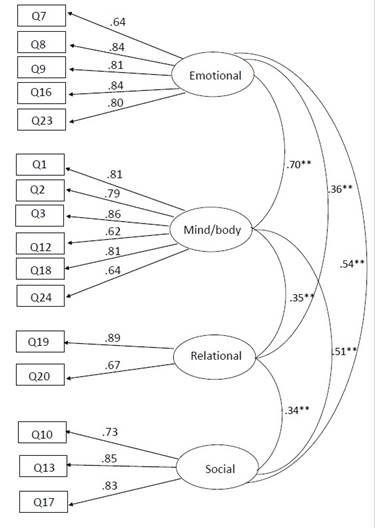 Figure 1. The four factor model of Core FertiQoL. Standardized factor loadings and correlations of subscales are presented. **p < .01.